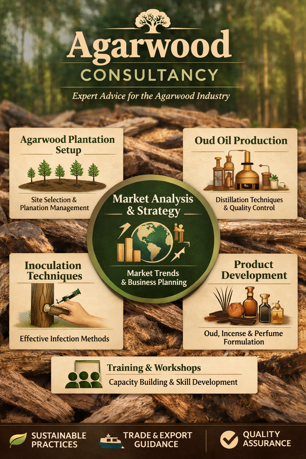 We offer expert consultancy services for individuals, businesses, and investors looking to establish or optimize Agarwood farming, processing, and trade operations. Our team of specialists provides end-to-end solutions, ensuring sustainable and profitable agarwood production.
